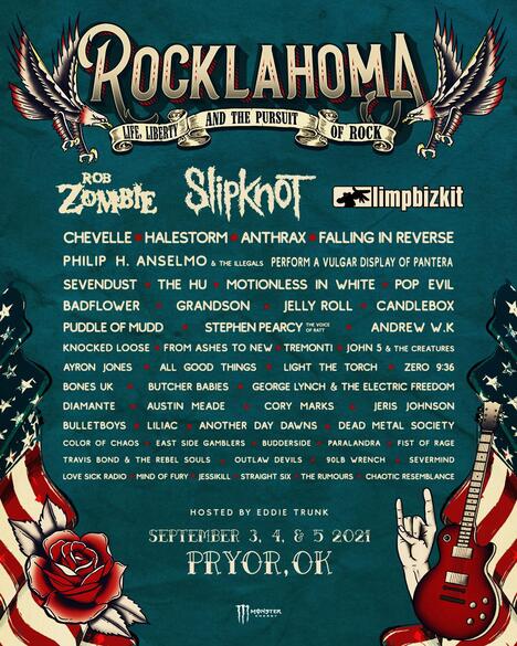 The music lineup for Rocklahoma 2021 is as follows (subject to change): Slipknot, Limp Bizkit, Rob Zombie, Chevelle, Halestorm, Anthrax, Falling in Reverse, Philip H. Anselmo & The Illegals Perform A Vulgar Display Of Pantera, Sevendust, The Hu, Motionless In White, Pop Evil, Badflower, Grandson, Jelly Roll, Candlebox, Puddle Of Mudd, Stephen Pearcy The Voice Of Ratt, Andrew W.K., Knocked Loose, From Ashes To New, Tremonti, John 5 And The Creatures, Ayron Jones, All Good Things, Light The Torch, Zero 9:36, Bones UK, Butcher Babies, George Lynch & The Electric Freedom, Diamante, Austin Meade, Cory Marks, Jeris Johnson, BulletBoys, Liliac, Another Day Dawns, Dead Metal Society, Color Of Chaos, East Side Gamblers, Budderside, Paralandra, Fist Of Rage, Travis Bond & The Rebel Souls, Outlaw Devils, 90LB Wrench, Severmind, Love Sick Radio, Mind Of Fury, Jessikill, Straight Six, The Rumours, and Chaotic Resemblance.