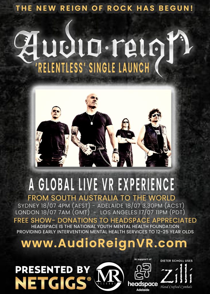 ADELAIDE, AUSTRALIA (June 24, 2021) — Australian rockers AUDIO REIGN announce their live virtual reality, VR, live stream by Netgigs on July 18th. Join the boys as they get set to unleash their explosive brand new single ‘RELENTLESS’ to the world. Pre-save the new single Relentless: https://smarturl.it/Audioreign. This very special Sunday afternoon event will be held at Crown and Anchor in Adelaide South Australia. For more information or to watch the VR live stream visit: http://www.AudioReignVR.com