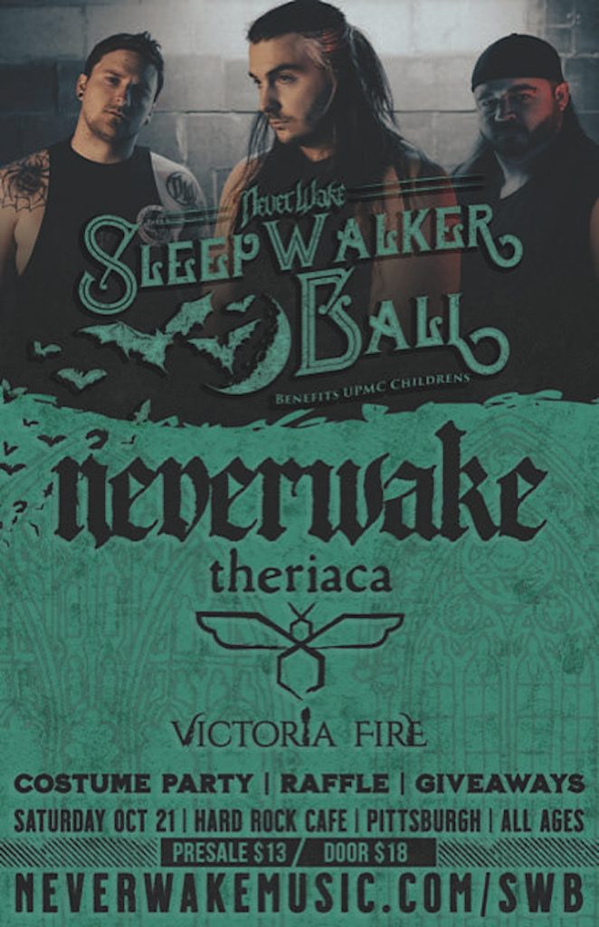 Sleepwalker Ball is an annual charity event benefiting UPMC Children’s Hospital. This year’s fundraiser is themed as a Halloween masquerade party. In addition to live music there will be a costume contest with prizes given away to the top three winners. Schecter guitars, who endorse NeverWake, lend their support to the event by donating a guitar that will be raffled off to one lucky ticket holder. The guitar is traditionally signed by all of the musicians that performed that evening. All musicians and crews that participate in the event, donate their time and talent for this worthy cause.