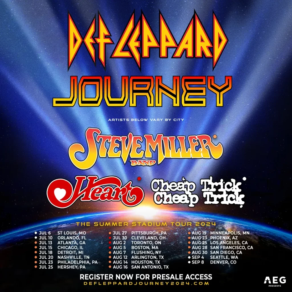 Def Leppard and Journey team up with Steve Miller Band, Heart, and Cheap Trick! for a 23-Date 2024 Summer Stadium tour that kicks off July 6, 2024, at Busch Stadium in St. Louis and will conclude at Coors Field in Denver on Sept. 8, 2024.