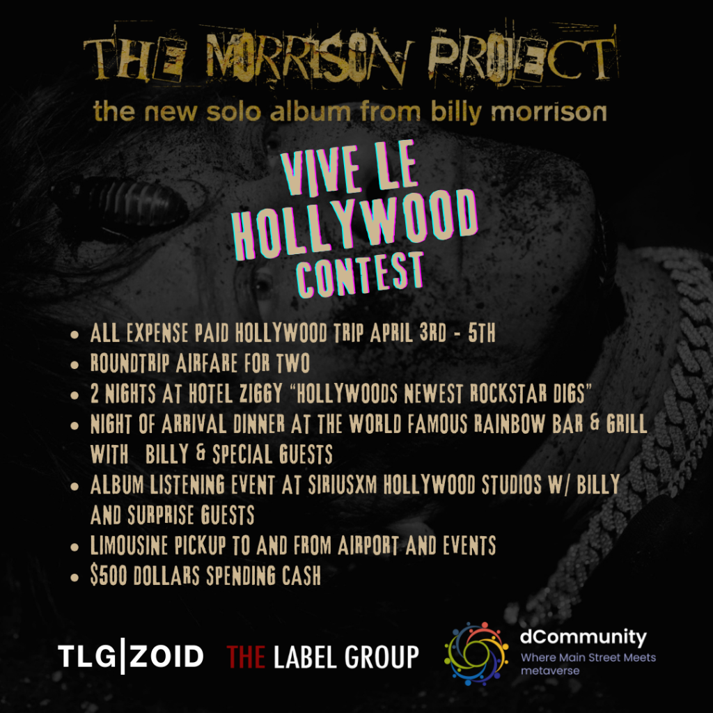 Billy Morrison announces the exciting “Vive Le Hollywood” Contest, powered by dCommunity, to celebrate the release of his latest single, “CRACK COCAINE,”with the extraordinary talents of Ozzy Osbourne and Steve Stevens. Get ready to immerse yourself in the electrifying essence of Hollywood, where creativity knows no bounds. Join us in this unparalleled celebration of music and artistry. Don’t miss the chance to be part of something extraordinary—Vive Le Hollywood!