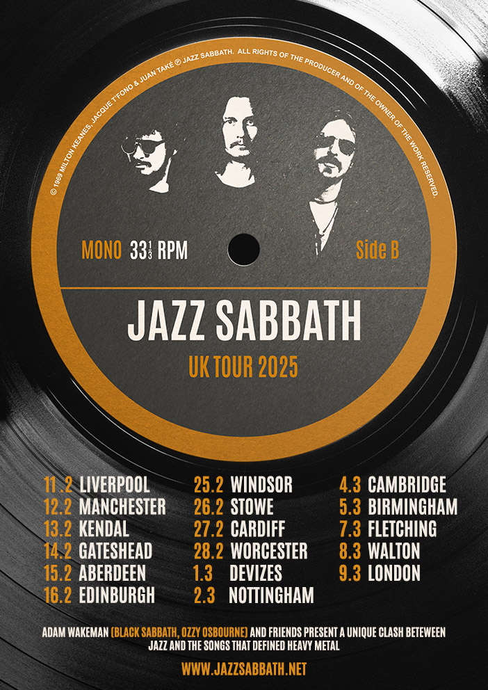 Jazz Sabbath, the jazz trio helmed by Adam Wakeman (keys Black Sabbath, Ozzy Osbourne) has announced a 17-date UK tour in 2025. This summer, the trio is scheduled to play 2 shows in Los Angeles and an Australia tour.
