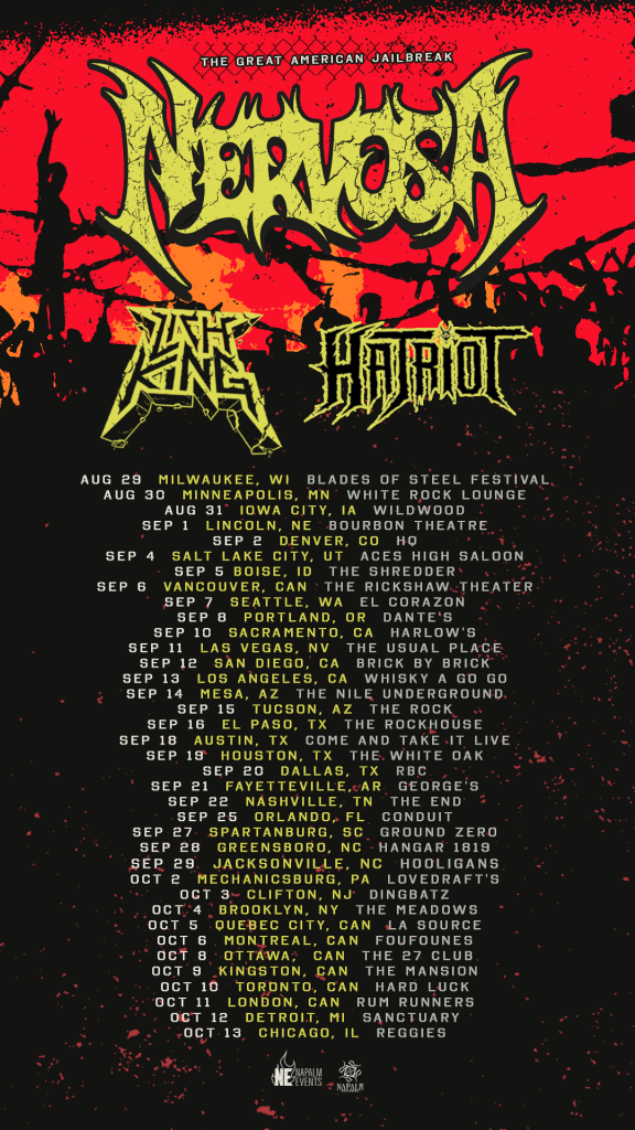 Thrash metal mavens NERVOSA recently released their blistering fifth full-length, ‘Jailbreak’, to major acclaim. They have now set their sights on North America, announcing their first headline tour of the USA and Canada beginning in late August 2024! On the road for nearly a month-and-a-half, the tour will visit major locations such as Las Vegas, Los Angeles, Vancouver, Brooklyn, Montreal, and Chicago – including seven total stops in Canada – coming to an end in mid-October. The tour will feature support from Lich King and Hatriot.
