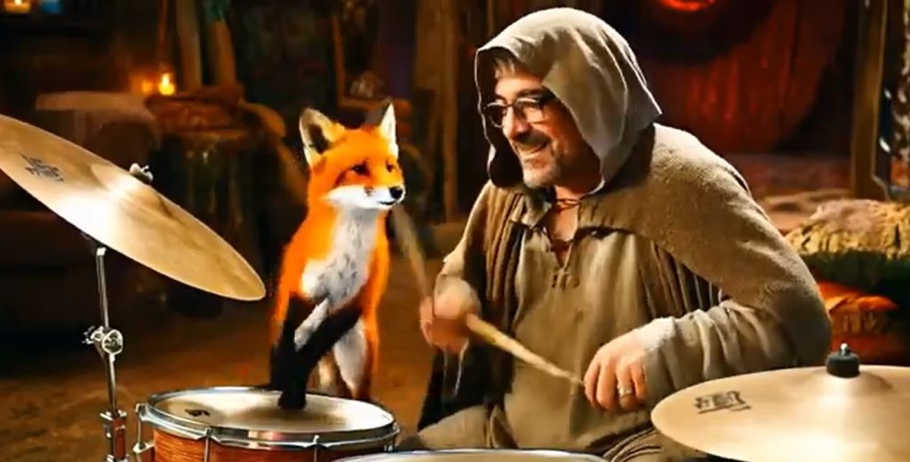 Unavailable on streaming digital sites like iTunes or Spotify, Refestramus’ “Fox on the Run” is exclusively on YouTube, and is mainly an A.I. presentation except for Agent M dancing, running, and making joyful faces to the song, plus band member shots. However because Derek Ferguson loves playing with A.I., he turned his bandmates into glam stars, most notably the end of the video with Craig’s face as a fox. He also has an A.I. fox visiting him and Derek Pavlic in the recording studio.