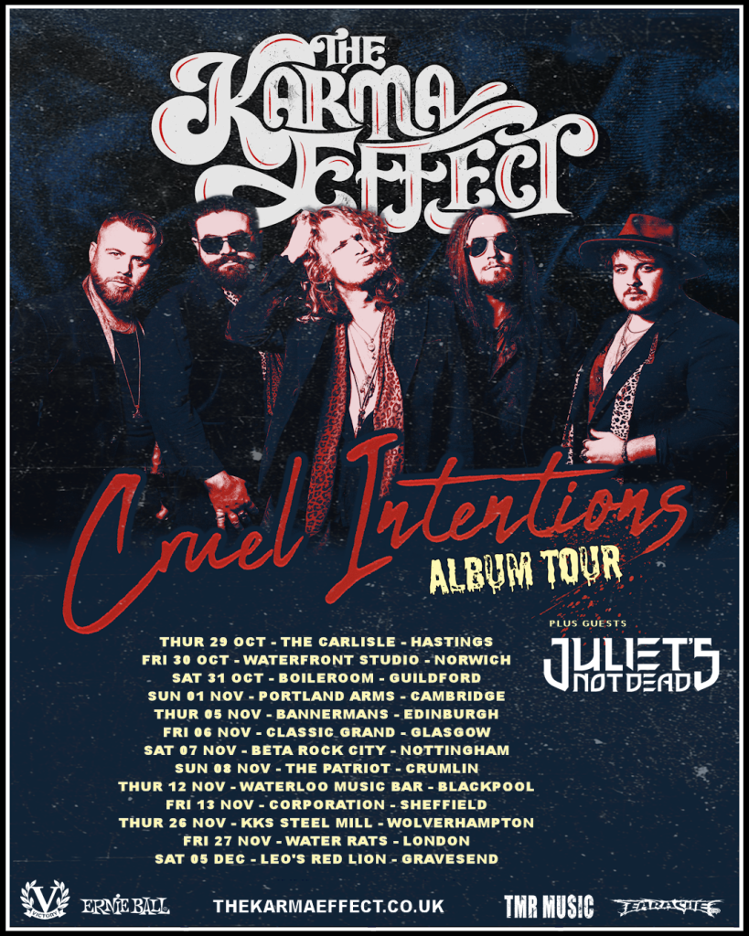 Sat 18 Apr – Echo Hotel Music Club – Hook Fri 15 May – The Forum – Tunbridge Wells – ALBUM RELEASE SHOW Sat 06 Jun – The Lexington, London w/ Jared James Nichols Sat 14 July – SOS Festival 2026, Whittles, Oldham – Saturday Headline Sat 15 August – Nozfest 2026, 1865, Southampton THUR 29 OCT – THE CARLISLE – HASTINGS FRI 30 OCT – WATERFRONT STUDIO – NORWICH SAT 31 OCT – BOILEROOM – GUILDFORD SUN 01 NOV – PORTLAND ARMS – CAMBRIDGE THUR 05 NOV – BANNERMANS – EDINBURGH FRI 06 NOV – CLASSIC GRAND – GLASGOW SAT 07 NOV – BETA ROCK CITY – NOTTINGHAM SUN 08 NOV – THE PATRIOT – CRUMLIN THUR 12 NOV – WATERLOO MUSIC BAR – BLACKPOOL FRI 13 NOV – CORPORATION – SHEFFIELD THUR 26 NOV – KKS STEEL MILL – WOLVERHAMPTON FRI 27 NOV – WATER RATS – LONDON SAT 05 DEC – LEO’S RED LION – GRAVESEND https://thekarmaeffect.co.uk/live/