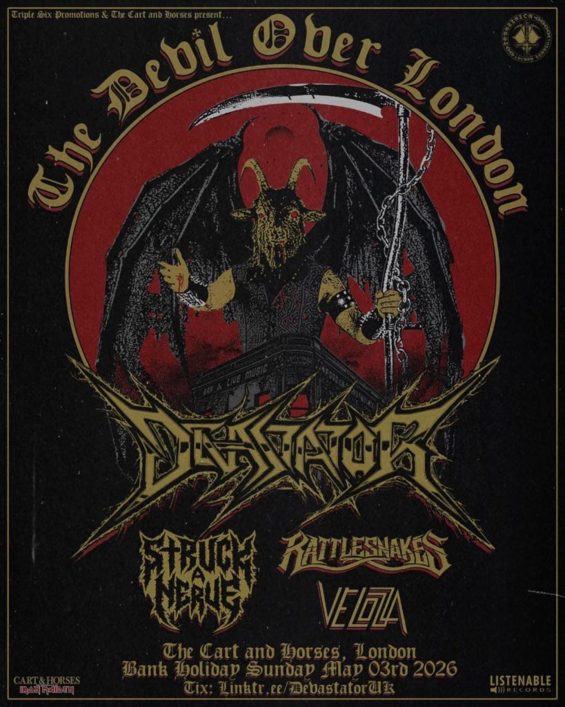 Check RATTLESNAKES out live with label fellows Struck A Nerve and Devastator at London Cart and Horses on May 3rd, 2026.